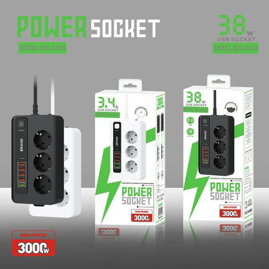 Разклонител с защита от претоварване, 3 AC изхода + 6 USB