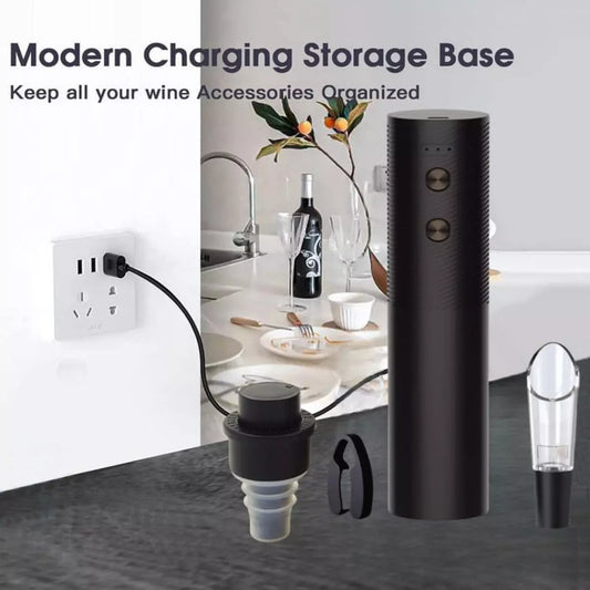 Комплект 4 в 1 електрически тирбушон за бутилка вино, нож за фолио, тапа за вино, накрайник за наливане, черен