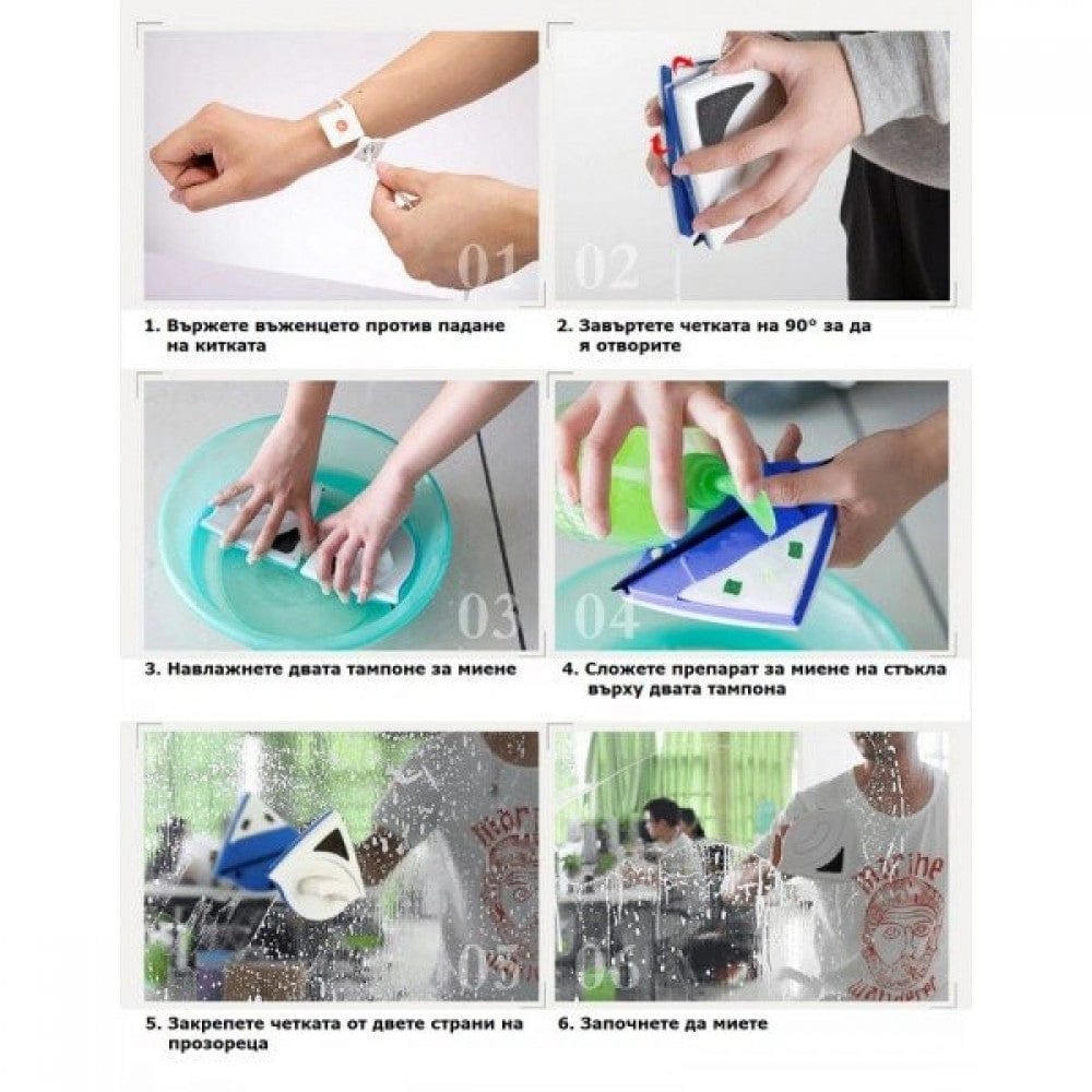 Вече има Смарт чистачка за прозорци. С нея лесно миете труднодостъпни прозорци едновременно отвън и отвътре. Спестявате много време, нерви, неудобства и т.н. Само за секунди можете да почистите прозореца си без да се налага да се надвисвате навън и да се страхувате от падане и нараняване.Четката е с много силен магнит, едната част се слага на външната част на прозореца, другата се поставя от вътрешната, прилепва здраво и започвате да движите отвътре, като четката мие в същото време отвътре и отвън едновременно.. След това лесно се почиства и е готова за следващото миене. Има допълнително въженце, което се слага на ръката ви, за да предпази четката от падане навън.Подходяща за всякакви прозорци и стъклопакети с дебелина от 3 до 8 мм, както и за двойни прозорци със дадената дебелина.Преди употреба, моля, прочетете внимателно указанията за ползване, снимковия материал към него, както и видеото което е за референция.