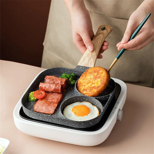 Мултифункционален тиган за закуска, незалепващ, дървена дръжка с 3 отделения