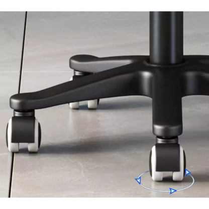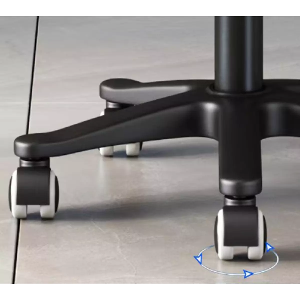 Амортисьорът на стола позволява лесно регулиране на височината, за да отговаря на индивидуалните нужди и предпочитания на всеки потребител. Добавената гъвкавост се допълва от петте колелца, които осигуряват лекота при преместване и маневриране на стола, улеснявайки прехода между различните работни пространства.