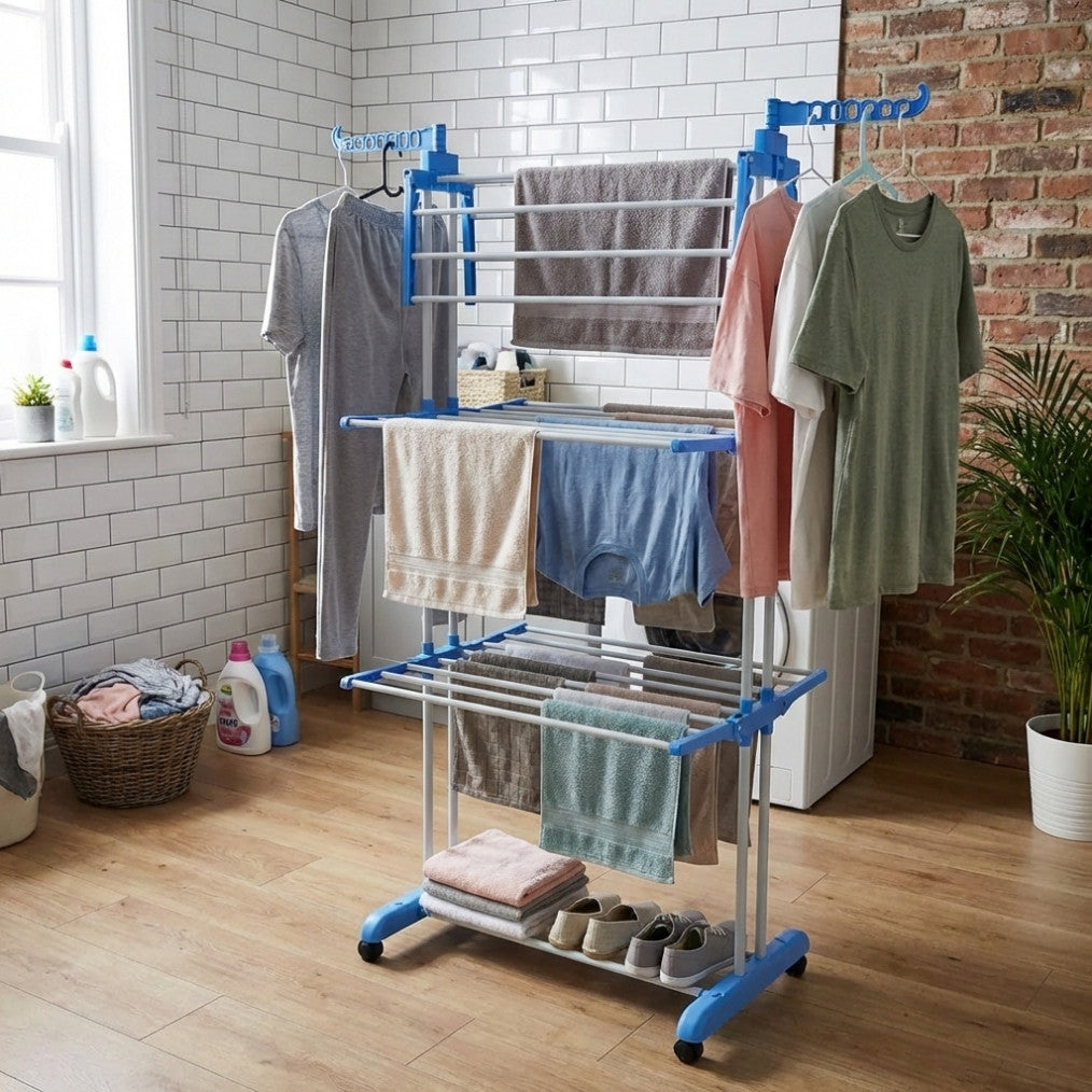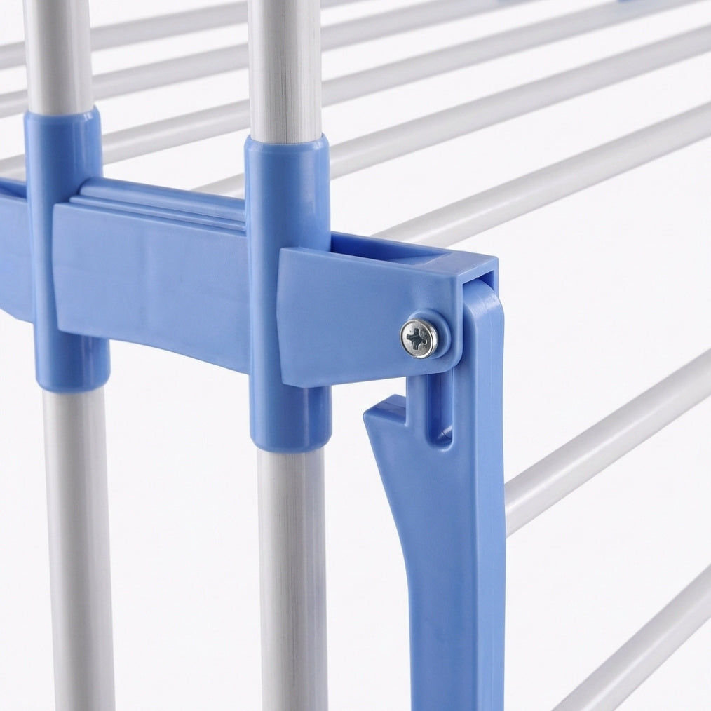 Функционален и удобен сушилник, създаден за дома с ограничено пространство. Разполага с три двустранни сгъваеми нива и държачи за закачалки, които позволяват сушене на голямо количество дрехи едновременно.