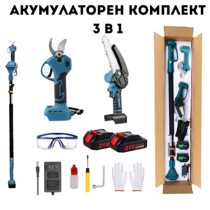 Комплект Телескопичен прът 2,5м с Акумулаторна градинска ножица и Акумулаторен трион с 15см шина с безчетков мотор