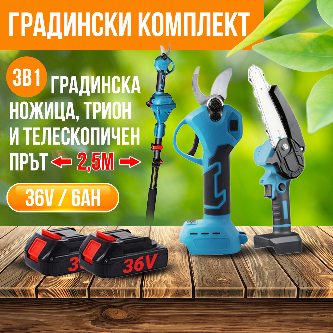 Превърнете градинарството в лека и приятна работа с нашия Немски комплект aкумулаторна лозарска ножица и aкумулаторен трион с 15см шина.