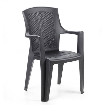Този пластмасов стол с подлакътници предлага релефна шарка и структура, която е устойчива на разтягане и напрежение. Благодарение на UV функцията срещу слънчева светлина, той запазва своя цвят в продължение на години, осигурявайки ви дълготрайна елегантност за вашия външен интериор.