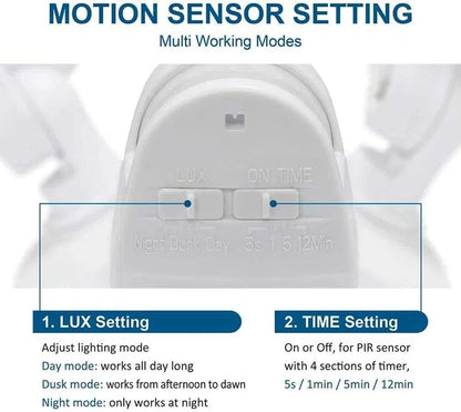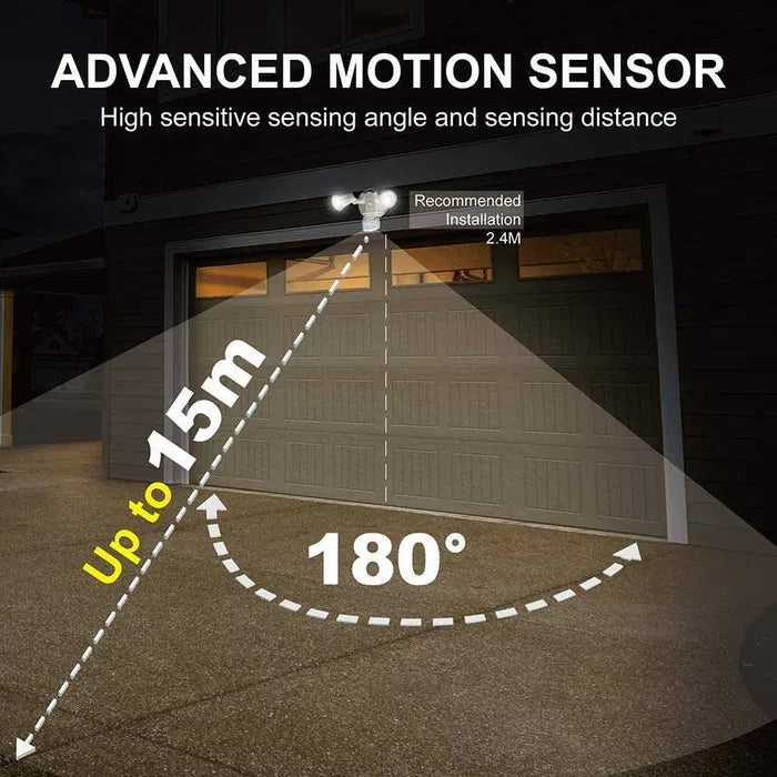 Както сензорът, така и светлинните глави предлагат завъртане на 180 ° и могат лесно да се регулират, за да променят посоката на светлината и обхвата на наблюдение, за да ви осигурят ярка светлина във всяка посока, която искате. Сензорът може правилно да открие движение до 15 метра.