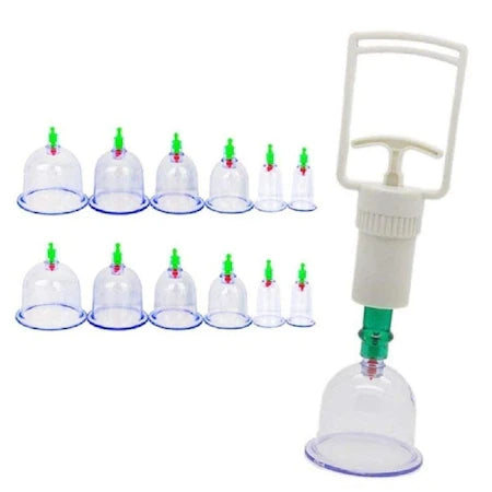 Комплект от 12 масажни смукателни чаши, Вакуумна помпа, Терапевтична функция, Прозрачен