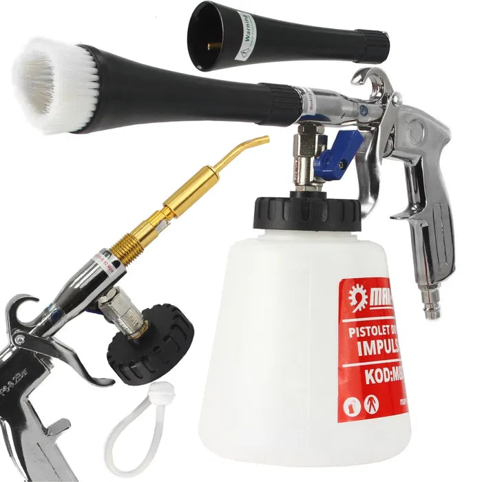 Специален пистолет за пране с въртяща се дюза за почистване, предназначен за пране на всички видове тапицерии на автомобили, мокети, мебели, пластмаси, джанти, огледални елементи, въздушни отвори и много други неща.