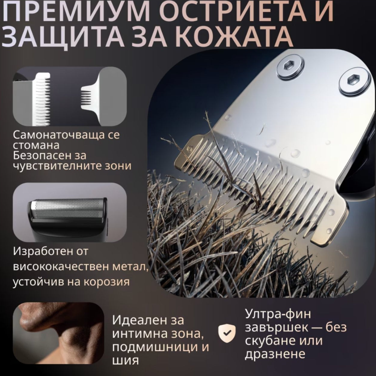 Създаден за мъже, които държат на детайла, комплектът съчетава мощност, прецизност и удобство. Остриетата режат гладко и равномерно, без дърпане и дразнене, а различните приставки ти позволяват да постигнеш точния стил – от перфектно оформена брада до чисти линии и фино подстригване.