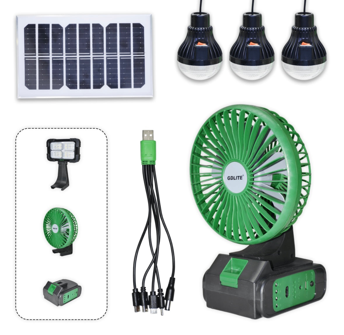 Соларната осветителна система GD-8082 е универсално и енергоспестяващо решение за осветление и охлаждане на външни и закрити пространства. Тя комбинира соларно захранване, вентилатор, 3 крушки и прожектор, предоставяйки удобство, комфорт и ефективност на едно място.