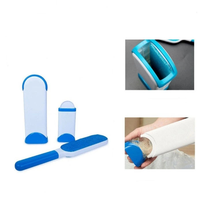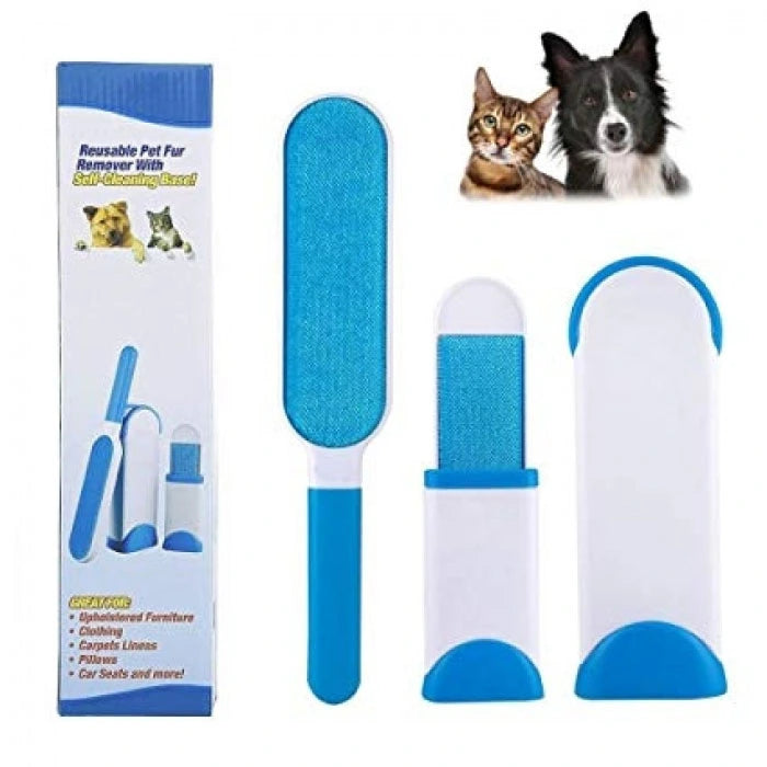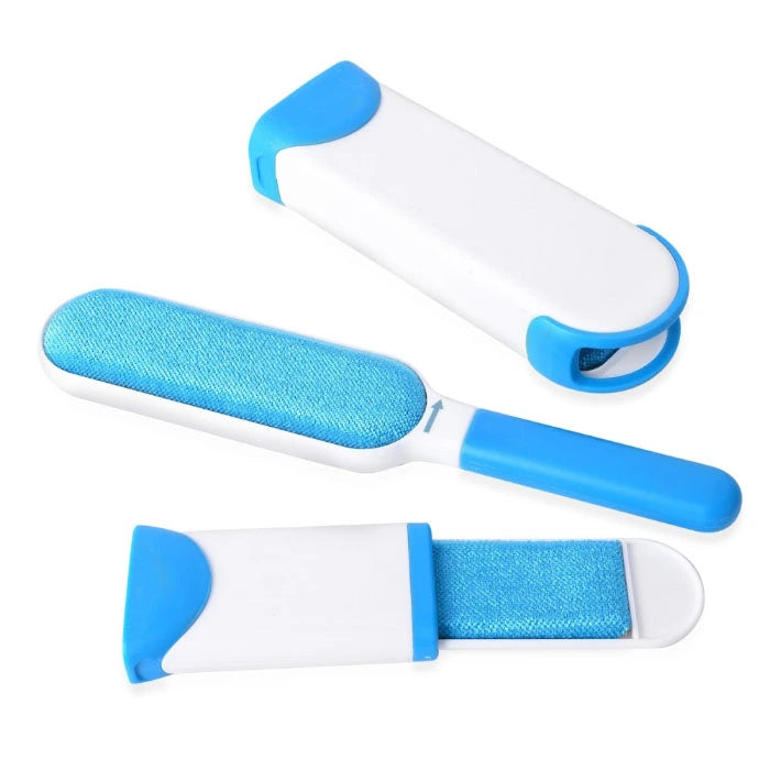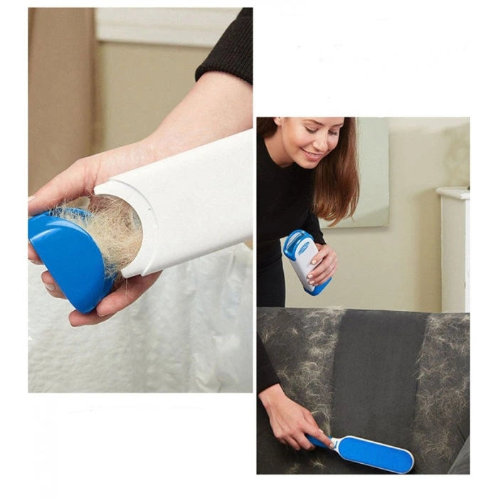 Проблемът с почистването на космите от мебелите и дрехите изисква много усилия и труд, но не е нужно да прибягвате до крайни мерки нужен ви е само правилният помощник. С този уникален комплект четки, почистването на изпадналите косми от домашни любимци става изключително бързо и лесно. Двулицевата  четка за събиране на косми е изключително практична и подходяща за ежедневно използване. Тя е произведена от специален материал, който може да улавя дори и по малките власинки, само с едно минаване по повърхността на мебелите и дрехите. Четката разполага и със специален контейнер, който позволява изчистване на четката без дори да е нужно да я  докосвате, трябва да се постави и издърпа, всички косми остават вътре в контейнера.