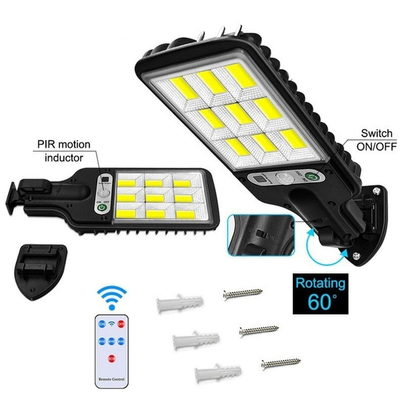 Нов иновативен модел LED лампа със сензор за движение.Лампата е с вградени мощни COB светодиоди. Осветява безпроблемно Вашата градина, барбекю, тераса и други. Зарежда се чрез вграден соларен панел през деня и работи през нощта. С три режима на работа.В комплекта има включена стойка за монтаж с регулиране на ъгъла.