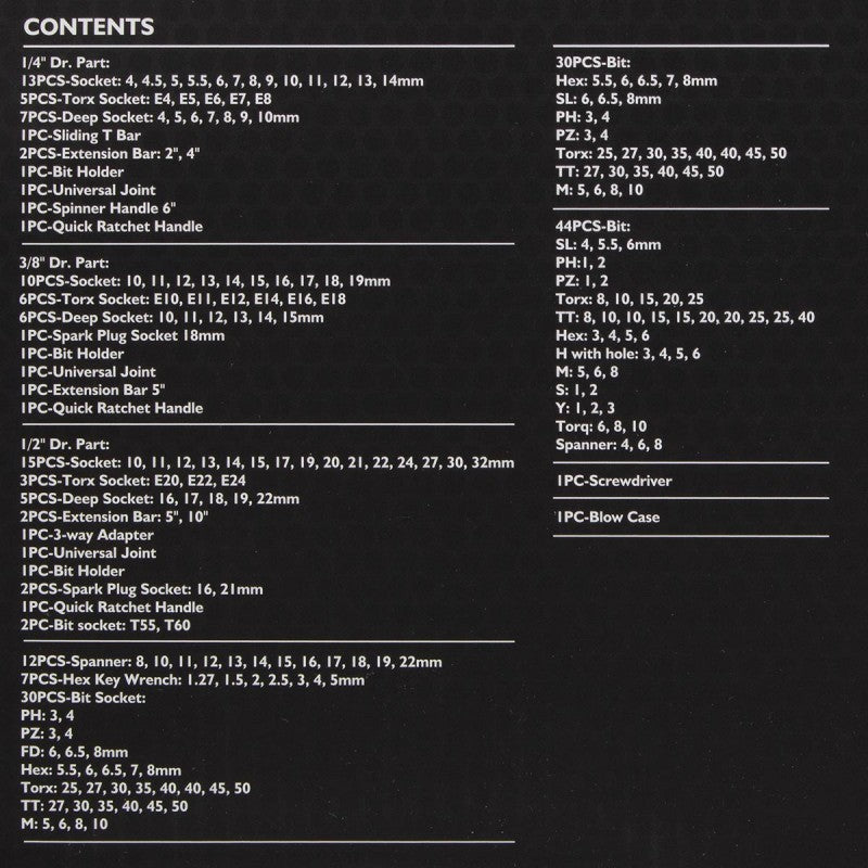1/4" Вложки: 50 и 100 мм удължители, универсална връзка, плъзгаща T-дръжка 110 мм, въртяща се дръжка 150 мм, магнитна бормашина 200 мм