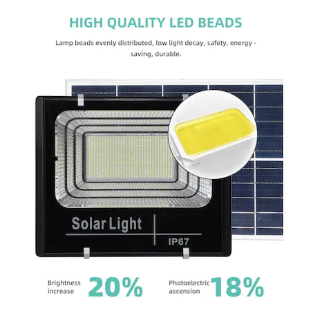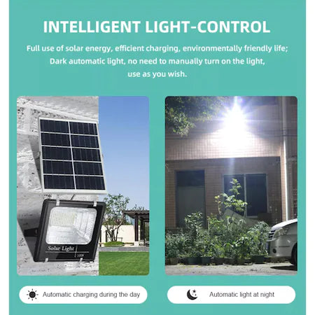 Изключително мощна соларна лампа тип прожектор с ярка LED светлина. Захранва се от слънчева и дневна светлина посредством фотоволтаичен панел. Той преобразува светлинната енергия в електрическа, зареждайки акумулаторна. Щом се стъмни, светлинен сензор активира светлината на лампата автоматично. Прожектора може да осветява в продължение до 8-12 часа в зависимост от режима. Соларния панел е отделен от лампата и се свързва към нея посредством 4.4 метров кабел.