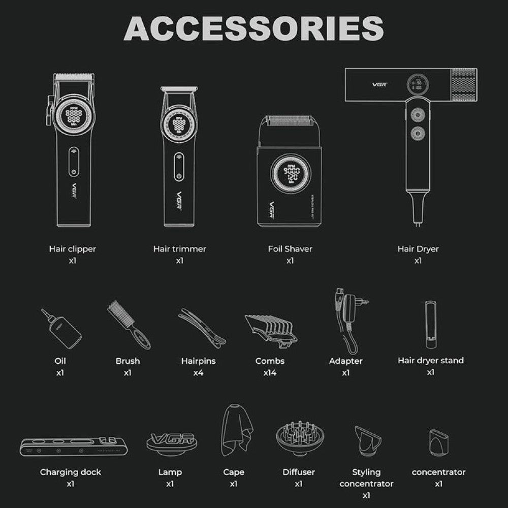 VGR Professional Barber Combo 4 в 1 – Професионален комплект за подстригване (Черeн)